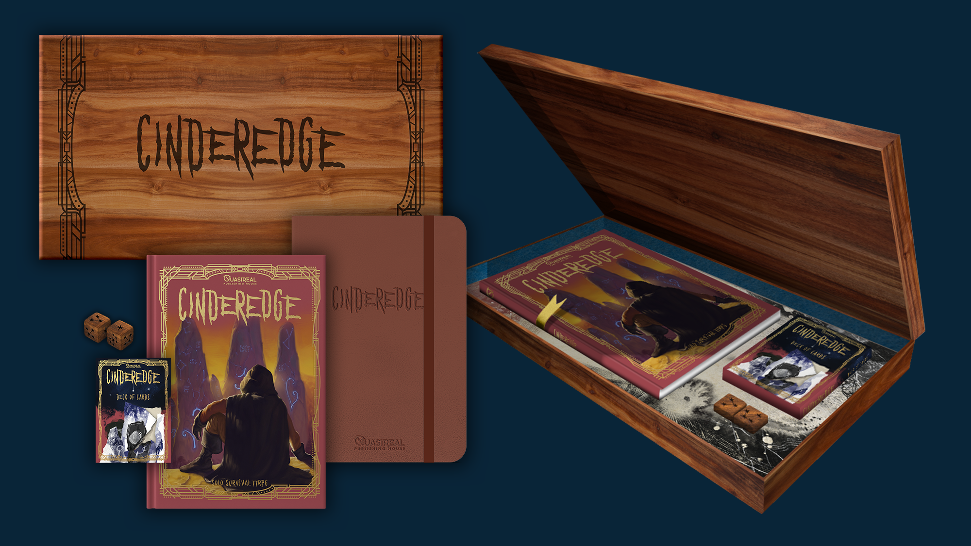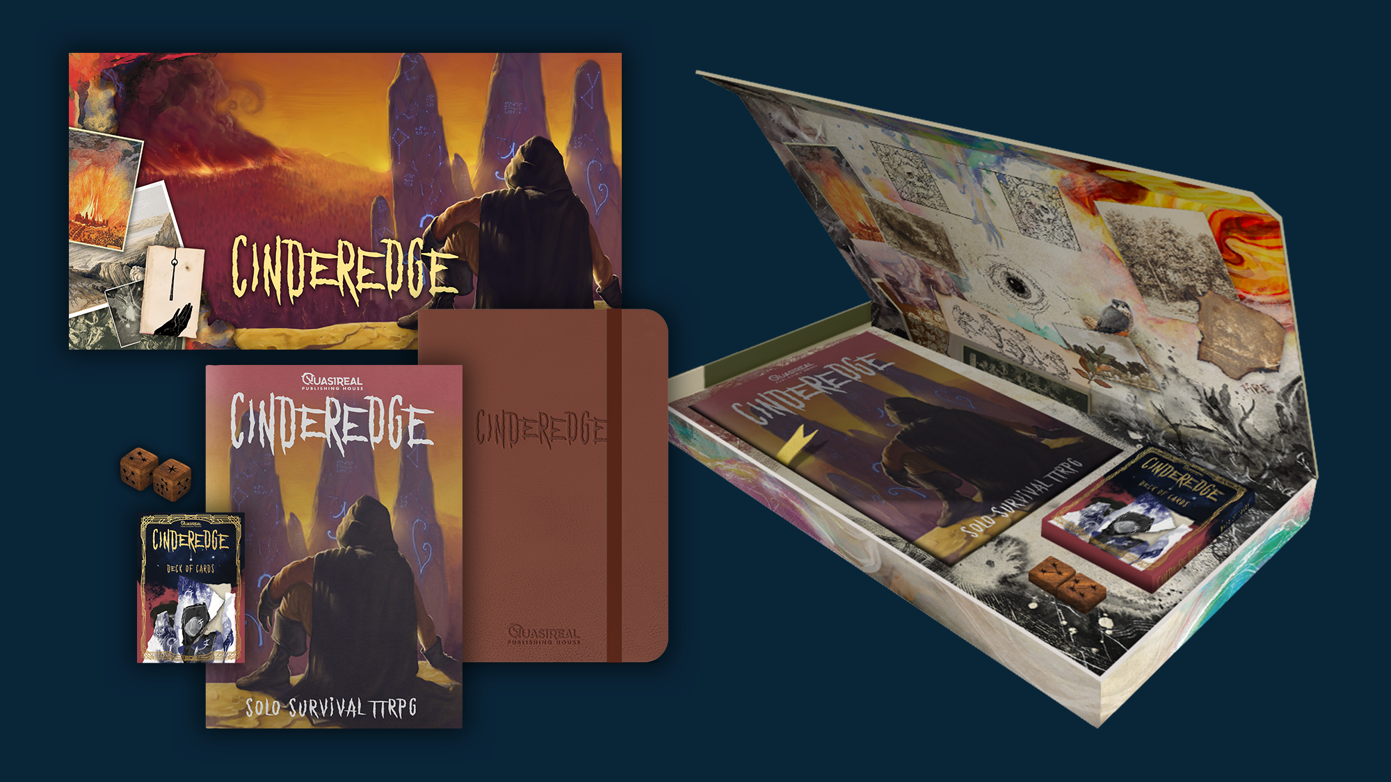 Premium print quality zine and journal, with a custom deck of playing cards and custom wooden d6 dice with constellations for pips. Everything you need to play Cinderedge in a fully printed magnetic close box.